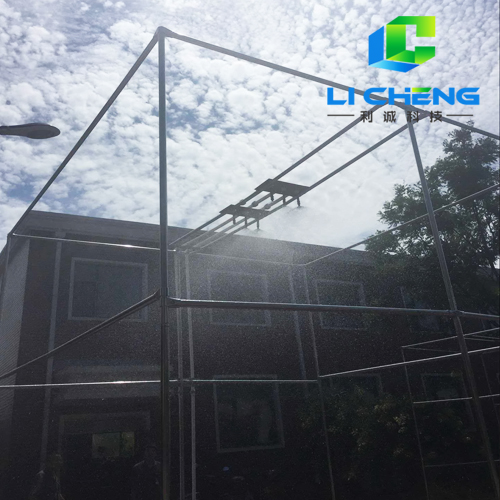 噴霧單元由供水管路、直管段、噴嘴、支架等組成,噴嘴采用世界上專業(yè)生產(chǎn)模擬雨滴噴頭的美國SPAYING SYSTEMS公司生產(chǎn)的FULLJET旋轉(zhuǎn)下噴式噴嘴,不銹鋼材質(zhì),噴嘴和直管段集成在一起,噴霧支架為不銹鋼方管結(jié)構(gòu),用來架設(shè)供水管路和噴嘴。
