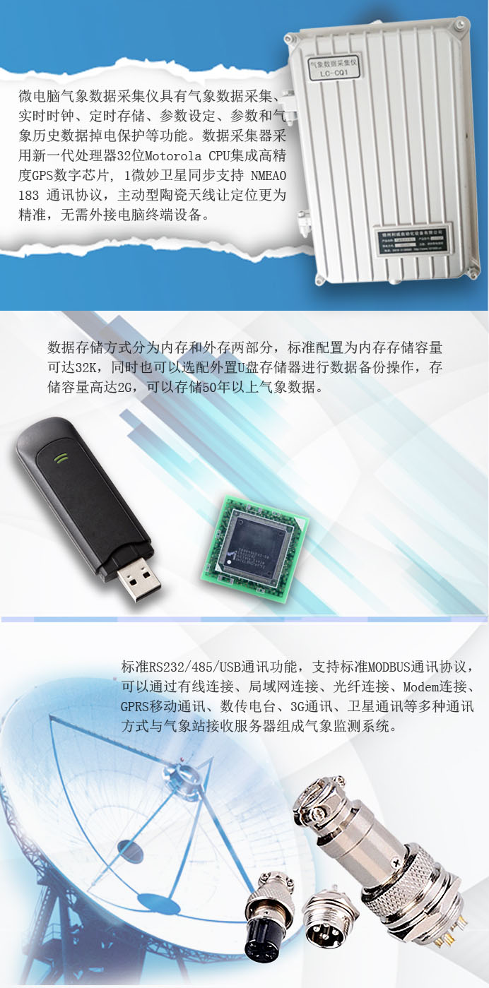 2、微電腦氣象數(shù)據(jù)采集儀具有氣象數(shù)據(jù)采集、實(shí)時(shí)時(shí)鐘、定時(shí)存儲(chǔ)、參數(shù)設(shè)定、參數(shù)和氣象歷史數(shù)據(jù)掉電保護(hù)等功能。數(shù)據(jù)采集器采用新一代處理器32位Motorola CPU集成高精度GPS數(shù)字芯片, 1微妙衛(wèi)星同步支持 NMEA0183 通訊協(xié)議,主動(dòng)型陶瓷天線讓定位更為精準(zhǔn),通過氣象監(jiān)測軟件可以準(zhǔn)確定位查看監(jiān)測區(qū)域的氣象環(huán)境數(shù)據(jù),方便于移動(dòng)觀測氣象數(shù)據(jù),工業(yè)控制標(biāo)準(zhǔn)化設(shè)計(jì),便攜式防振結(jié)構(gòu),漢字液晶鍵盤人機(jī)界面,使用先進(jìn)的雙屏顯示技術(shù),主屏顯示實(shí)時(shí)氣象數(shù)據(jù)信息,輔屏顯示地理狀況信息包括方位、高度、天氣預(yù)報(bào)資料等等,人機(jī)界面友好,便于現(xiàn)場實(shí)時(shí)查看氣象分析數(shù)據(jù),無需外接電腦終端設(shè)備。