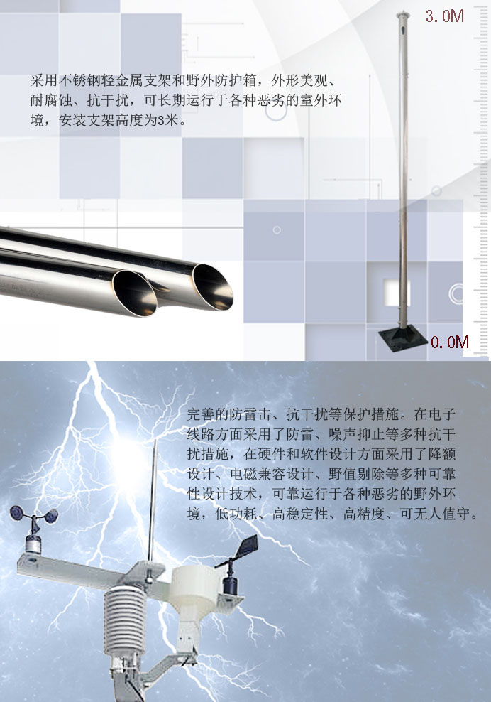 7、采用不銹鋼輕金屬支架和野外防護(hù)箱,外形美觀、耐腐蝕、抗干擾,可長期運(yùn)行于各種惡劣的室外環(huán)境,安裝支架高度為3米。